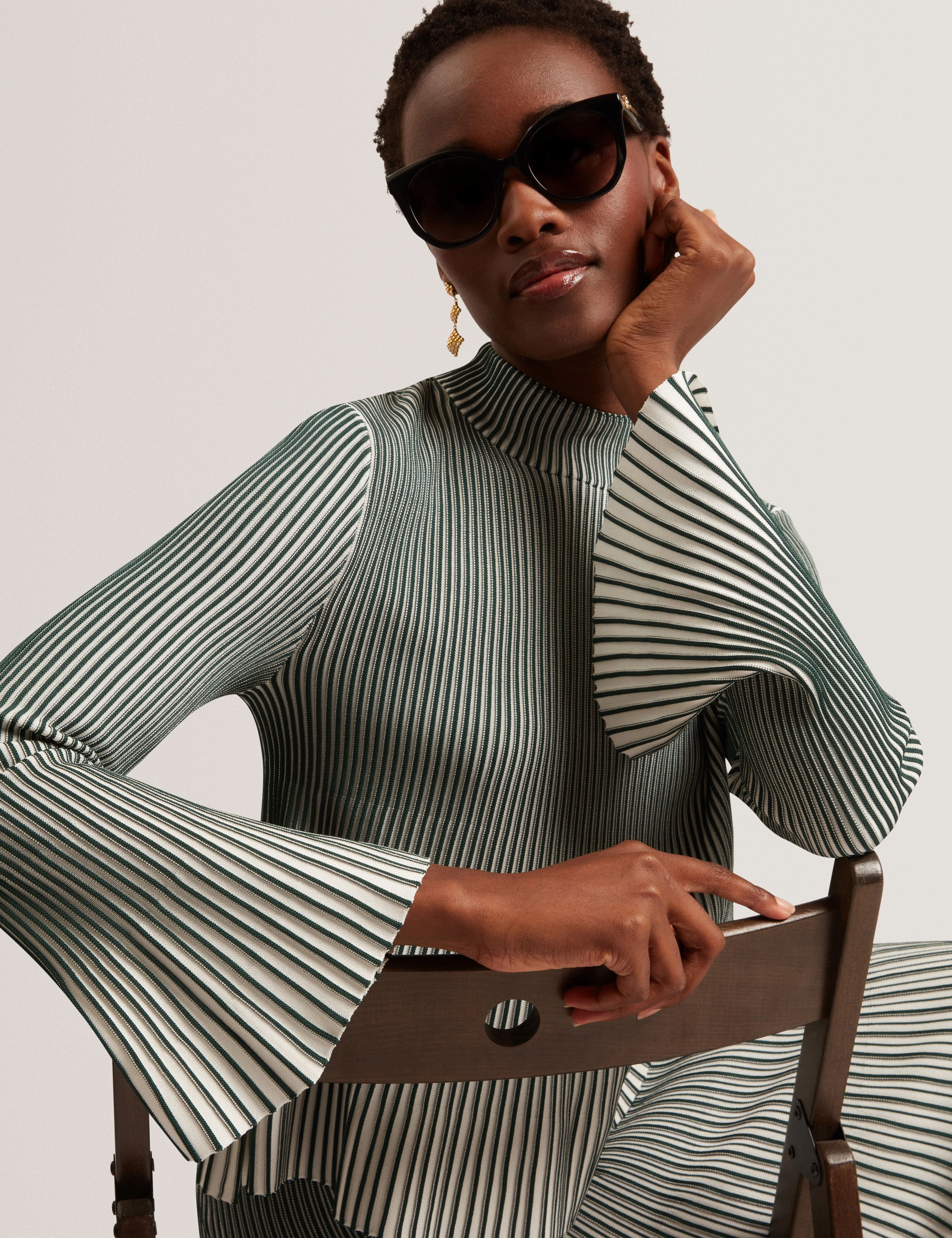Ribbed knit texture Fluted sleeves and hem for movement Slim fit that flatters the figure Soft, stretchy fabric Suitable for casual or dressier looks